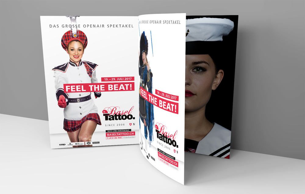 Basel Tattoo:Für alle Events der Basel Tattoo Productions GmbH gestalte ich sämtliche Drucksachen von Flyern, Plakaten, Magazinen, über Einladungen bis hin zu Tram- und Buswerbung und vieles mehr. Dabei sind alle Fotos aus meiner Kamera.